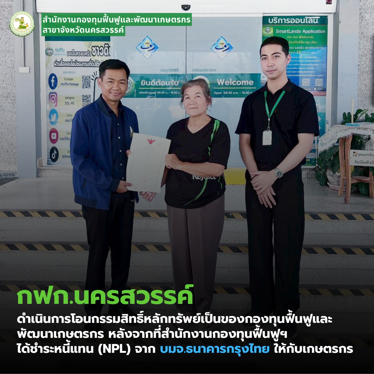 วันที่ 29 ตุลาคม 2568 นางทิพวรรณ์ เกตุหนู หัวหน้าสำนักงานกองทุนฟื้นฟูและพัฒนาเกษตรกร สาขาจังหวัดชัยนาท รักษาการในตำแหน่งหัวหน้าสำนักงาน สาขาจังหวัดนครสวรรค์ มอบหมายให้ ว่าที่ร้อยตรี ยงยุทธ เกษาโร พนักงานอาวุโส และนายสุกฤษฏิ์ ทิมศิลป์ เจ้าหน้าที่งานจัดการหนี้ ดำเนินการโอนกรรมสิทธิ์หลักทรัพย์เป็นของกองทุนฟื้นฟูและพัฒนาเกษตรกร หลังจากที่สำนักงานกองทุนฟื้นฟูและพัฒนาเกษตรกรได้ชำระหนี้แทน (NPL) จาก บมจ.ธนาคารกรุงไทย ให้กับเกษตรกร จำนวนเงิน 487,794.83 บาท สามารถรักษาที่ดินทำกินไว้ให้เกษตรกร และดำเนินการโอนตามกฎหมายกองทุนฟื้นฟูฯ จำนวน 1 แปลง เนื้อที่ประมาณ 11 ไร่ – งาน 10 ตารางวา